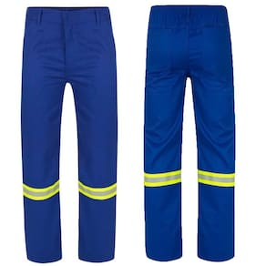 As faixas refletivas da calça com 5 centímetros de largura, sendo a faixa colorida em verde fluorescente 100% poliéster e a faixa central de material altamente refletivo com 2 centímetros.