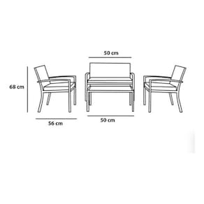 Composto por um sofa de dois lugares, duas poltronas e uma mesa, o conjunto oferece assentos espacosos e confortaveis para ate 4 pessoas. O acabamento em vime rattan sintetico confere elegancia e durabilidade, tornando-o perfeito para varandas, jardins e areas de convivencia.