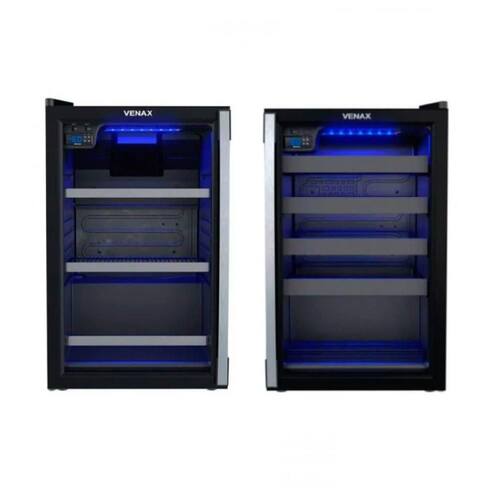 Conjunto Venax Cervejeira Blue Light 82L com porta invertida e Adega Piubella Cave para 24 garrafas. Controle digital de temperatura, iluminação interna em LED azul e sistema de refrigeração por compressor.Controle de temperatura