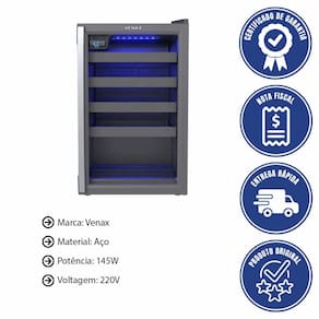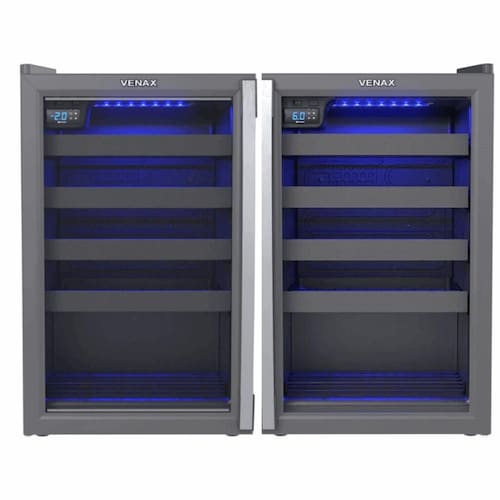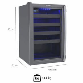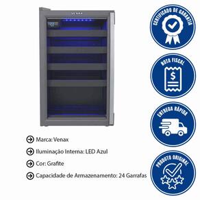 Conjunto Venax Expositora Champanheira Porta Invertida e Adega Piubella 100L Grafite 220V com controlador digital de temperatura, iluminação LED azul, porta de vidro duplo (LOW-E), sistema de refrigeração por compressor e capacidade para 24 garrafas.Capacidade total de garrafas