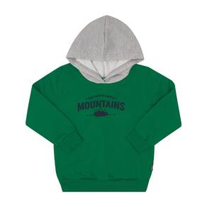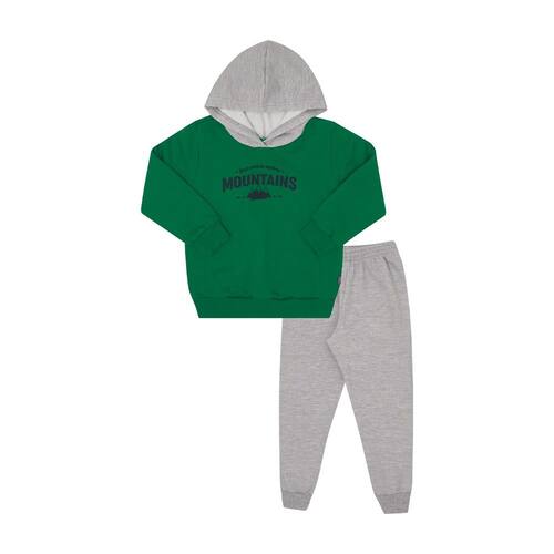 Ocasiões especiais ou passeios divertidos merecem um look confortável, quentinho e estiloso para os pequenos aventureiros. Confeccionado em moletom, o conjunto consta com blusão de manga lnoga na cor verde que contém capuz na cor marinho e estampa frontal de montanhas com escrita "Só quero explorar montanhas". A calça na cor mescla cinza possuí elastano na cintura e na canela, deixando o look confortável e seguro para o seu pequeno.\n