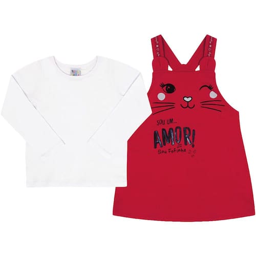Novo conjuntinho Pulla Bulla super estiloso e quentinho. Salopete na cor Vermelho confeccionado em Moletinho com estampa de gatinho e detalhe em bordado de paetê e uma Blusa na cor Branco confeccionada em Meia malha proporcionando ainda mais conforto. Sua garotinha vai ficar um amor, bela e fofinha com esse look.\n