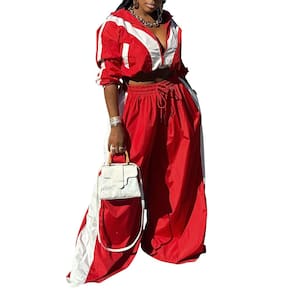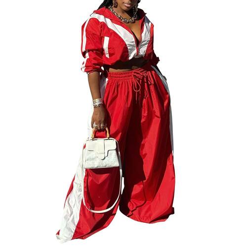 Angsuttc Conjunto de 2 peças para jogger feminino, cores contrastantes, jaqueta cropped e calça de perna larga