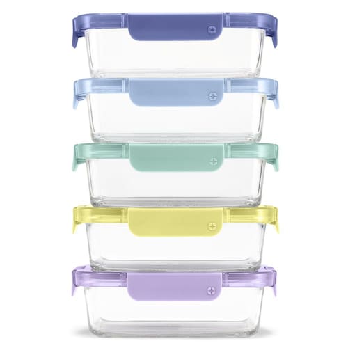 Ello Color Lock 3,4 xícaras, 10 peças, pacote com 5 conjuntos de preparação de refeições de vidro à prova de vazamento, recipientes de armazenamento de alimentos com tampas de plástico herméticas sem - Pacote com 5 recipientes de preparação de refeições: os recipientes de armazenamento de alimentos Ello Color Lock 10 peças incluem (5) recipientes de alimentos de vidro de 3,4 xícaras e cinco tampas de plástico sem BPA para manter os alimentos frescos por mais tempo. - Vidro durável e limpo: os recipientes são feitos de vidro de alta qualidade que resiste a manchas e odores. Esqueça de esfregar para se livrar de manchas e cheiros. - À prova de vazamento e hermético: tampas herméticas de encaixe travam para garantir que não haja derramamentos e manter os alimentos frescos por mais tempo. As tampas são livres de BPA e podem ser lavadas no freezer e na prateleira superior da lava-louças. - Fácil de usar: seguro para forno e micro-ondas sem tampa. Seguro para freezer. Todas as peças podem ser lavadas na prateleira superior da lava-louças.
