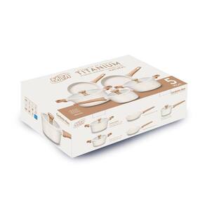 Conjunto de Panelas Titanium Natural Bege MTA - 5 Peças + 4 Talheres de Nylon Supreme Leve para sua cozinha a combinação perfeita entre elegância, praticidade e qualidade com o Conjunto de Panelas Titanium Natural Bege MTA. Produzido com revestimento interno antiaderente de alta performance, ele permite preparar alimentos com menos óleo, garantindo mais saúde e facilidade na limpeza. Seu design sofisticado em tom bege com cabos de efeito madeira une beleza e funcionalidade, proporcionando segurança no manuseio. As tampas em vidro temperado com saída de vapor permitem acompanhar o cozimento sem perder sabor e nutrientes. O kit ainda acompanha 4 utensílios de nylon Supreme MTA concha, colher, espátula e escumadeira , resistentes a altas temperaturas, perfeitos para uso em panelas antiaderentes sem danificar o revestimento. Diferenciais: Revestimento antiaderente durável e fácil de limpar Cabos e pegadores com efeito madeira: estilo + segurança Tampas de vidro temperado com saída de vapor Utensílios de nylon resistentes, que não riscam as panelas Conjunto completo para o dia a dia Conteúdo do Conjunto: 01 Frigideira 24 cm 01 Frigideira 28 cm 01 Caçarola 20 cm com tampa de vidro 01 Caçarola 24 cm com tampa de vidro 01 Panela 16 cm com tampa de vidro 04 Utensílios de Nylon Supreme concha, colher, espátula e escumadeira Ideal para: Quem busca praticidade, estilo e qualidade na cozinha, com um conjunto versátil que atende desde o preparo das refeições até o servir à mesa Marca: Não Informado