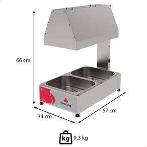 - Equipado com lâmpada infrared de 250W, cuba inox GN 1/2? e interruptor com proteção de silicone antirrespingos, ele assegura que o excesso de óleo seja escorrido adequadamente, mantendo a temperatura ideal para suas frituras.