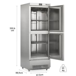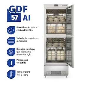 Características Técnicas: Conservação e exposição de produtos congelados Temperatura: -18 a -22C Refrigeração: Ar forçado com evaporador aletado Microventilador eletrônico Controlador eletrônico com indicador de temperatura Degelo: Automático 3 níveis de prateleiras reguláveis Portas cegas com puxador cava embutido e fechamento automático Revestimento: Interno em Aço Inox 304 fosco Externo em Aço Inox 304 escovado Parte frontal com resistência no quadro de portas Rodízios com trava que facilitam a movimentação Construção do Gabinete: Monobloco
