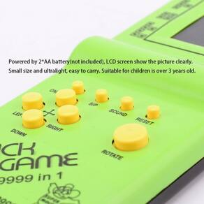 Características: Feito de ABS + componente eletrônico, durável. Máquina de jogos infantis, bom brinquedo de fantasia para crianças. Brick Snake Tetris, suporte, jogos, jogos, etc. Divertido e adequado às preferências das crianças. Alimentado por 2 pilhas AA (não incluídas), a tela LCD reflete a imagem com clareza. Tamanho pequeno e ultraleve, fácil de transportar. Adequado para crianças com mais de 3 anos. Especificações: Tipo: console de jogos portátil\ nQuantidade: 1 unidade\ nTecla: ON/OFF, S/P, som, reset, cima, baixo, esquerda, direita, girar\ nTamanho da tela: 4* 2,9 cm/1,6* 1,1 “(L * W)\ Tamanho do item: 18,3* 7,8* 2,5 cm/7,2* 3,1* 1 (L * W * H) Peso líquido: 72 g/2,5 oz Pacote: 1* console de jogos portátil 1* caixa de embalagem