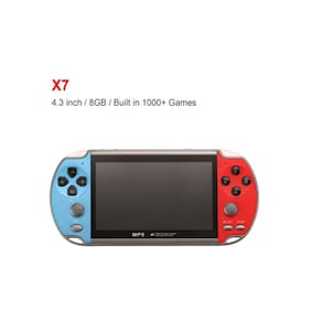 Características:\ nTela grande de alta definição de 7 polegadas (4,3 “/5,1"), melhor qualidade de imagem, proteção para os olhos. Console de jogos multifuncional, também suporta vídeo, música, e-books e outras funções. Memória de 16 GB/8 GB, mais de 1000 jogos embutidos, compatível com expansão de cartão TF. Suporta saída de vídeo de interface AV, conecte TV ou outras telas. Modo de controle duplo Cross Key + Rocker, jogando jogos de luta livremente. Especificações: Modelo: X7/X7 Plus/X12/X12 Plus Tipo: console de jogos\ nCor: azul e vermelho e vermelho-azul\ nMaterial: ABS Tamanho da tela: 4,3/5,1/7 polegadas” Console de jogos embutido: 1000 + Capacidade da bateria: 2500 mAh Método de download: conecte à porta USB do computador para baixarFormato de vídeo: BMVB, FLV, AVI, MP4, 3GP (suporta reprodução de vídeo 1080* 720P) voltar) Formato de música: MP3, WMA, WAV, etc. Se ele suporta economia de progresso:\ nExpansão máxima de memória:\ nCartão TF máximo de 32G (não incluído)\ nSe ele suporta saída AV: Sim\ nTamanho do pacote: 28,5* 13,5 * 5 cm/11,2 * 5,3* 2,0\ nPeso da embalagem: 504 g/17,8\ nLista de pacotes: 1 * Console de jogos\ n1 * Cabo de carregamento\ n1 * Fone de ouvido\ n1 * Manual do usuário