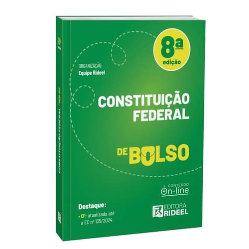 Destaques: CF: atualizada até a EC nº 135/2024 Edição atualizada até 06/01/2025 A Editora Rideel, atendendo à necessidade de estudantes e profissionais da área jurídica por obras compactas que permitam a rápida consulta ao texto legislativo plenamente atualizado e com preço acessível, criou a Coleção de Bolso 2025. São livros que trazem a legislação seca em volumes independentes, com formato especial e que você poderá levar para qualquer lugar. A obra proporciona: Leitura agradável; Notas remissivas elaboradas por especialistas em cada área; Diversos facilitadores de consulta (ex.: índice sistemático e detalhado índice alfabético-remissivo); A coleção abrange as principais áreas do Direito e é composta de 8 títulos: Constituição Federal, Código Civil, Código de Processo Civil, Código Penal, Código de Processo Penal, Consolidação das Leis do Trabalho, Código Tributário Nacional e Código de Trânsito Brasileiro. Tradição, qualidade editorial e preço acessível, esta é a Coleção de Bolso da Editora Rideel! Atualizações publicadas até 31-10-2025 disponíveis gratuitamente. Acesse: apprideel