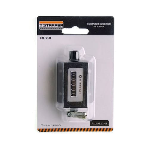 Contador Numérico De Batidas 5 Algarismos Starfer Fabricado em ferro e cromado e com ótimo acabamento. Utilizado para contagens em geral, contador mecânico com 5 dígitos e botão de zeragem. Corpo plástico com base matálica com furação para adaptação em máquinas e equipamentos. Possui alavanca com mola para fixação. Dimensões: Comprimento: 55mm Largura: 30mm Altura: 30mm Base: 53 x 47mm