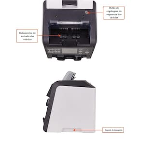 Capacidade do hopper 600pcsCapacidade do stacker 200pcsMoedas real, dolar, euro + 5 moedas estrangeirasFunções: soma, lotes, mix, add, tela touch screenTamanho das cédulas: 100mm175mm - 50mm90mmEspessura das cédulas: 0.05mm0.12mmVelocidade (pcs / min): 800,1000,1200 (mix mode) / 800,1000 (serial number reading mode)Ram: 1gLotes: 5-199pcsConectividade: usb for data collection and software upgradeRs232 for pc communicationRj 12 for external displayWlan for data collection and software upgrade in batchDetecção de cédulas falsas:Ultraviolet detection(uv)Magnetism detection(mg)Metal thread detection(mt)Infrared image detection(ir)Double sides image detection / 2 cisPower supply: bivolt ac 220v 50hz 10% ac 110v 60hz 10%Dimensão: 287 (h) x 240 (w) x 232 (d) mmPeso: 5.9 kgGarantia: 12 meses para defeitos de fabricaçãoAssistência técnica em todo o brasil