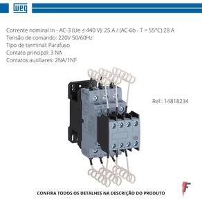 Características técnicas: Modelo: cwbc25-21-30d23 Referência: 14818234 Corrente nominal: 25a Contato auxiliar: 2na e 1nf Tensão de comando: 220v Tipo de terminal: parafuso Marca: Não Informado