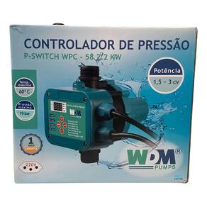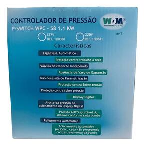 - Liga / Desliga Automático - Válvula de retenção incorporado - Ausência Vaso de Expansão - Display Digital (Pressão em tempo real) - Pressão do Sistema Auto Ajustável conforme cada Bomba - Não necessita de Parametrização - Proteção contra trabalho à seco - Proteção contra Sobre tensão e Sobre pressão - Religamento automático - Após longo tempo sem operação, o sistema aciona protegendo contra o travamento da bomba - Poderá utilizar o controlador Press com motores trifásicos através de contatora. - Utilizado para água limpa até temperatura de 40ºC. - Pressão máxima de 90mca - Vazão máxima de 5m³/h. - Grau de Proteção IP-65. - Frequência de 50/60HZ.
