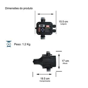 Controlador automático de pressão, necessita ser instalado/rosqueado no recalque de bombas com motores Monofásicos até 3,0 cv em 220 V ou até 1,0 cv em 127 V para pressurização de residências, construção civil e de equipamentos em geral compatíveis com as caraterísticas do produto. Possui as funcionalidades: liga/Desliga automaticamente; válvula de retenção incorporada; ausência de vaso de expansão; display digital; pressão do sistema auto ajustável conforme cada bomba; não necessita de parametrização; proteção contra trabalho a seco; proteção contra tensão e sobre pressão; Religamento automático; sistema contra travamento da bomba, devido após longo tempo de utilização acionar o equipamento. Utilizado para água limpa até temperatura de 40ºC com vazão máxima de 5m³/h e pressão máxima de 90mca. OBS.: O modelo de bomba a ser utilizado deverá estar condizente com os dados de projeto na qual será instalado. Construído em termoplástico. Válvula de retenção em latão.
