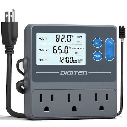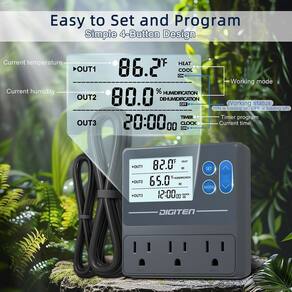 Marca: DIGITEN Modelo: THT103 Função: Controlador digital de temperatura e umidade com plugue de tomada de temporizador: 3 estágios. Este termostato versátil é projetado para fornecer controle preciso sobre os níveis de temperatura e umidade em seu terrário de répteis, aquário, área de cultivo de cogumelos ou configuração de cerveja caseira. Com o DIGITEN THT103, você pode facilmente definir e monitorar os níveis de temperatura e umidade desejados com sua função de exibição digital e temporizador. O plugue de saída de 3 estágios permite que você personalize as configurações para um desempenho ideal. Se você precisa criar um ambiente aconchegante para seus répteis, manter as condições ideais para seus animais de estimação aquáticos, regular os níveis de umidade de seus cogumelos ou controlar o processo de fermentação em seu projeto de fabricação caseira, este termostato tem o que você precisa - Fácil de configurar e programar: nosso controlador de temperatura e umidade não requer configurações complicadas. Com apenas quatro botões simples e alguns passos fáceis, você pode alcançar as configurações desejadas sem esforço. Um dispositivo que atende a três requisitos funcionais - Três em um: Este controlador de umidade e temperatura pode se conectar a três dispositivos simultaneamente. As três tomadas têm funções distintas e podem ser usadas independentemente. Um para regulação de temperatura, um para gerenciamento de umidade e outro para configurações de ligar e desligar - Alta precisão: o controlador de temperatura e umidade fornece leituras em graus centígrados e Fahrenheit. Possui uma grande tela LCD e vem com um sensor de temperatura e umidade altamente preciso que detecta automaticamente as condições ambientais - Regulação flexível de temperatura e umidade: Este controlador permite várias combinações, como aquecimento com umidificação, aquecimento com desumidificação, resfriamento com umidificação e resfriamento com desumidificação. A função de temporização da terceira tomada também pode ser usada de forma independente - Aplicação extensiva: Este controlador de temperatura e umidade com temporizador é amplamente utilizado em estufas, para dragões barbudos, répteis, cobras, incubadoras, cogumelos, fabricação caseira, fermentação, viveiros e muito mais
