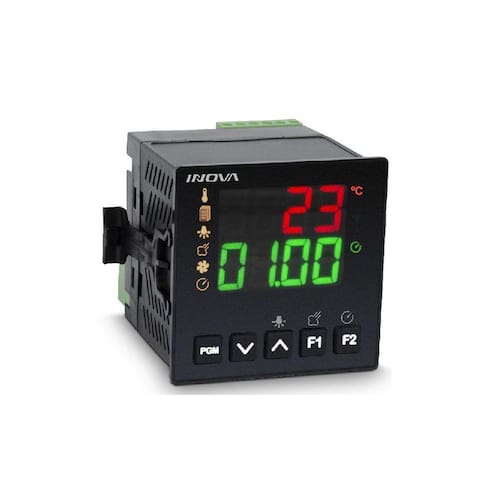 Controle de Tempo e Temperatura para sistema a Gás, Elétrico e a Lenha, com reversão de Turbina.Alimentação: 24 VAC/VCC.Temperatura de operação e Armazenamento: -10C a 60C.Sensor de temperatura utilizado: Termopar Tipo J o sensor não acompanha o aparelho .Temperatura de medição e controle: Tipo J de -10C a 760C. Entradas: 02 entradas para sensor de chama. 01 entrada para micro chave da porta. 01 entrada para START/STOP do temporizador. Saídas: 05 saídas a relé 5A/220Vca carga resistiva 01 saída para buzzer 12Vcc/20mA máx. .Caixa 72x72x69mm.Conexão com conector Pluggable paraufsos . Possui buzzer interno. Substitui o INV-19101/J, INV-32101/J e INV-20011/J.