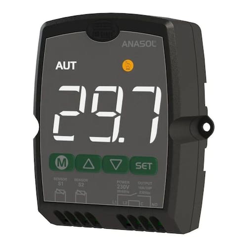 Controlador Diferencial De Temperatura New AnasolO consagrado Termostato Diferencial para Aquecimento Solar Anasol chega completamente RENOVADO Utilizado para sistemas de Aquecimento Solar em Piscinas ou reservatórios térmicos, aquecedores de água a gás ou elétrico, ar condicionado e geladeira.O que já era bom, ficou ainda MELHORCom a nova função de termostato convencional você pode usar o Anasol para:- Acionamento kick -start: você aciona o termostato quando quiser e ele desligara automaticamente quando atingir a temperatura desejada.- Ajuste fácil do tempo de funcionamento.- Consulta do tempo de acionamento manual sempre que quiser.Agora o Anasol pode ser configurado como termostato para refrigeração e aquecimento - você escolheEspecificações:- Tensão nominal de alimentação: 220VCA- Temperatura de operação: 0 a 50C- Temperatura de controle:Sensor T1: -20 a 200CSensor T2: -20 a 105C- Resolução: 0,1C entre -10 e 100C e 1C no- Dimensões do produto: 77 x 39 x 97mm- Sensores:Sensor T1: Coletor Solar - Sensor SB59, cabo branco, 1mSensor T2: Reservatório Térmico - Sensor SB19 cabo preto, 2m- Saída de controle:Saída de relé, máx. 1HP em 220Vca (HP em 127Vca)Ou 16A, resistência de 3500W em 220Vca (1750W em 127Vca) Marca: Fullgauge
