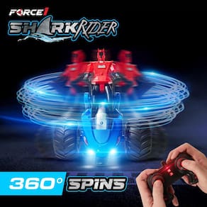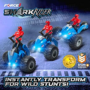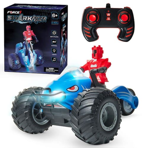 - Carro acrobático dinâmico de LED RC para crianças: mergulhe em brincadeiras de aventura com o Force1 Storm Rider. Este carro com controle remoto oferece cativantes 360 giros, pneus de borracha resistentes para excursões off-road, luzes LED luminosas e efeitos sonoros envolventes. Cada carro vem com um boneco de ação removível que pode sentar ou ficar em pé durante a viagem. Escolha entre os designs Shark Rider ou Storm Rider, tornando o jogo solo ou as corridas com amigos igualmente emocionantes. Ideal para quem é novo no mundo dos carros de controle remoto!