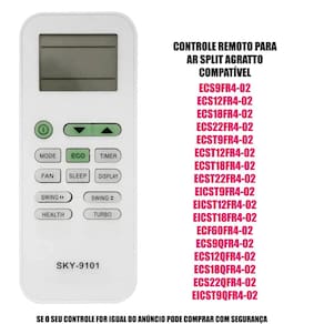 Controle remoto para ar split agratto kezp00b2da compatível Feito em plástico pvc resistente, com teclas emborrachadas e aderentes. Não gaste seu dinheiro com controles de qualidade duvidosa. Possui as mesmas características, botões e funções do . Não necessita programar, basta colocar as pilhas e usar, fácil e prático. - este produto é compatível com a marca e o modelo do anúncio. - fabricante: mbtech vc / wlw. - é alimentado por duas pilhas aa, que não são inclusas. - alguns modelos compatíveis: Ecs9fr4-02 Ecs12fr4-02 Ecs18fr4-02 Ecs22fr4-02 Ecst9fr4-02 Ecst12fr4-02 Ecst18fr4-02 Ecst22fr4-02 Eicst9fr4-02 Eicst12fr4-02 Eicst18fr4-02 Ecf60fr4-02 Ecs9qfr4-02 Ecs12qfr4-02 Ecs18qfr4-02 Ecs22qfr4-02 Eicst9qfr4-02 Eicst12qfr4-02 Eicst18qfr4-02