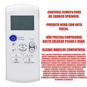 Além disso, o Controle Remoto Para Ar Split Carrier 40Kwqd18C5 40Kvcb30C5 é compatível com diversos modelos, como RG57, 41014045, 40KVCA36C5, 40KVCA48C5, 40KVCB30C5, entre outros. Verifique a lista completa de modelos compatíveis para garantir que ele seja adequado ao seu aparelho de ar-condicionado.