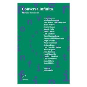 O que têm em comum escritores como Paul Auster, Siri Hustvedt ou J. M. Coetzee, músicos como Caetano Veloso ou Jorge Drexler, artistas como Sophie Calle, Anish Kapoor ou Marina Abramovic, pensadores como Julia Kristeva, Alain Badiou ou Slavoj Žižek, cineastas como David Cronenberg? Todos, em algum momento de suas vidas, estabeleceram uma interlocução decisiva com a psicanálise, seja pela experiência própria de análise, seja pelo modo crítico com que ela permeou suas obras e reflexões. O psicanalista argentino Mariano Horenstein percorreu o mundo para conversar com vinte personalidades, rastrear suas experiências com a psicanálise e transmiti-las sob a forma de entrevistas leves. A coleção de conversas reunidas neste volume nos permite conhecer essas personalidades por uma perspectiva mais íntima e despojada do que aquela que suas imagens públicas costumam exibir. São diálogos serenos, distantes do tom promocional, conduzidos em ritmo lento e que favorecem o surgimento de temas como o peso da tradição sobre o trabalho de cada um, as incertezas diante das próprias obras e as estratégias para não sucumbir ao vendaval da fama. Com tradução de Julián Fuks, Conversa infinita oferece uma visão fascinante sobre as relações da psicanálise com as artes e outros campos do saber. Entrevistas com: Marina Abramovic, Paul Auster e Siri Hustvedt, Alain Badiou, Sergio Blanco, Sophie Calle, Javier Cercas, David Cronenberg, Georges Didi-Huberman, Jorge Drexler, Peter Eisenman, Andrea Fraser, Luis González Palma, Anish Kapoor, Julia Kristeva, Hanif Kureishi, Daniel Libeskind, Caetano Veloso, Juan Villoro, Slavoj Žižek.