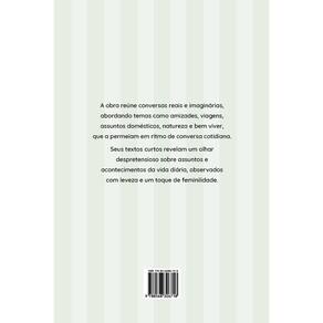 Sinopse do livro: A obra reúne conversas reais e imaginárias, abordando temas como amizades, viagens, assuntos domésticos, natureza e bem viver, que a permeiam em ritmo de conversa cotidiana. Seus textos curtos revelam um olhar despretensioso sobre assuntos e acontecimentos da vida diária, observados com leveza e um toque de feminilidade.
