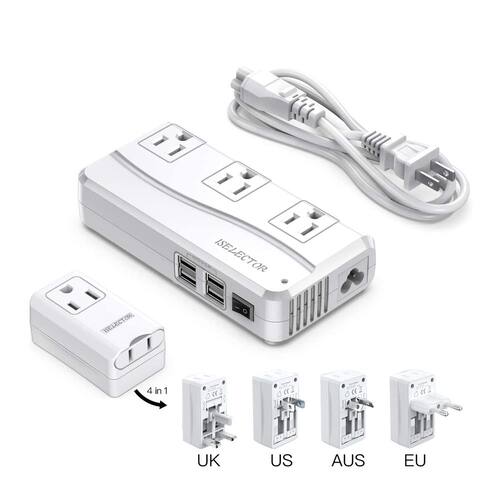ISELECTOR Adaptador universal de viagem, conversor de tensão de 250 W 220 V para 110 V com 8 portas de carregamento, conversor de adaptador de viagem internacional com adaptador de tomada mundial para Reino Unido/AU/EUA/Ásia, listado na ETL - ?Versão atualizada do adaptador universal de viagem?A tensão descendente converte a tensão de 240V/220V 50/60HZ para 120V/110V 60HZ, isso faz com que você possa usar seus eletrônicos padrão dos EUA 100-125V em todo o mundo. Com tecnologia patenteada, taxa de conversão de tensão do conversor de viagem ISELECTOR até 92%, 50% maior do que outros. - ?Adaptador de viagem compatível em todo o mundo?O conversor de 220 V para 110 V tem cabo tipo A de 1,5 m, que pode ser utilizado diretamente no Japão, China e outros países de tomada tipo A/B; adaptador de plugue com tipo A (JP), tipo C (UE), tipo G (Reino Unido) e tipo I (AU), compatível com a maioria dos países como América, Inglaterra, Alemanha, Japão, China, Austrália, França, África do Sul, Índia, Reino Unido. AE, etc, suporte para viagens. em mais de 150 países em todo o mundo. - ?Carregamento múltiplo e rápido?Com 4 tomadas CA e 4 portas USB, este combo adaptador conversor de energia pode carregar 8 dispositivos ao mesmo tempo para atender às suas várias necessidades de viagens internacionais. As portas USB com tecnologia IC inteligente podem identificar automaticamente seus dispositivos e fornecer velocidade máxima de carregamento de 2,4 A em cada porta. O adaptador de plugue pode ser utilizado separadamente, você terá 9 portas de carregamento em países tipo A - ?Garantia de 24 meses e garantia de segurança?ETL listado e aprovou o teste de segurança NRTL, hardware atualizado oferece proteção completa, sistema de proteção de segurança integrado que fornece proteção contra sobrecorrente, sobrecarga, sobreaquecimento e curto-circuito. Conversor de energia potente e de qualidade com ventilador de resfriamento eficiente para reduzir o calor, o ventilador funciona silenciosamente e não perturba seu sono à noite. - ?Design de viagem?O adaptador de viagem portátil é pequeno, compacto e conveniente. Basta colocar o tamanho compacto (15 x 7,6 x 4 cm) com cabo de alimentação destacável de 1,5 m na bolsa de armazenamento que pode manter o conversor de tensão limpo e economizar espaço. NOTA: Não use este conversor de energia para fornecer energia ao seu secador de cabelo, alisador de cabelo, modelador de cachos ou máquina de café, independentemente de sua potência.