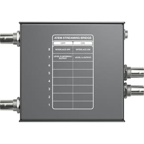 O atem streaming bridge da blackmagic design para switchers de streaming atem mini pro permite converter o sinal ip de qualquer unidade atem mini pro em vídeo sdi e hdmi. Ele possui duas saídas sdi e uma única saída hdmi e suporta resoluções de até 1080p60. Você pode conectar o streaming bridge diretamente à saída de streaming do seu atem mini pro, e ele fornecerá saídas sdi e hdmi para uso em ambientes de transmissão, ou diretamente a um monitor. Você também pode conectar o streaming bridge à mesma lan à qual um atem mini pro está conectado, e os dispositivos se encontrarão, permitindo que você transmita facilmente pela rede.
