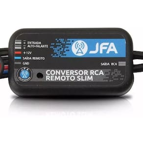 ESPECIFICAÇÕES TÉCNICAS: • Marca: JFA • Modelo: 463 • Entrada: 12V • 1 Saída RCA • Entrada Alto-Falante • Saída Remoto • Fio Terra para Proteção contra Excesso de Corrente • Carcaça em Plástico • Baixa Impedância de Saída • Alta Impedância de Entrada • Converte o Nível de Alto-falante para o de RCA