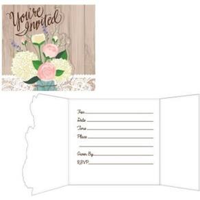 - Possui um fundo de textura de madeira marrom claro com lindas flores e detalhe de renda branca delicada, um título "você está convidado" e um espaço recarregável na parte de trás para detalhes de festa