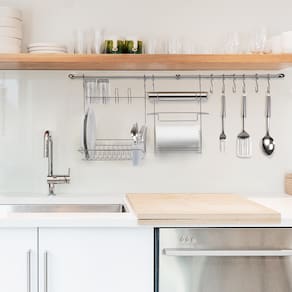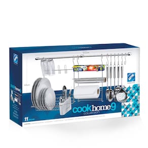 Cook Home 9 Arthi (Comprimento 100 cm) - Máxima Organização Suspensa O Cook Home 9 da Arthi é um sistema de organização de parede de grande porte, projetado para cozinhas que necessitam de máxima otimização vertical. Ele combina duas barras para criar um espaço de trabalho suspenso, mantendo utensílios, papel e louças acessíveis. Características Físicas e Funcionais: Design Suspenso: Utiliza o espaço da parede para liberar a bancada, otimizando a área de preparo de alimentos. Componentes do Kit: O conjunto completo é composto por:2 barras de 49 cm (montadas lado a lado, totalizando 100 cm de área útil). 6 ganchos para pendurar utensílios diversos. 1 porta rolos (para papel toalha, filme ou alumínio). 1 escorredor (ideal para pratos, copos, ou talheres). Instalação Completa: Acompanha kit de fixação (buchas e parafusos) para montagem segura e permanente na parede. Material Premium: Fabricado em Aço Cromado, garantindo resistência à umidade, durabilidade e um acabamento estético sofisticado. Marca: Arthi. Especificações Técnicas: Comprimento Total Montado: 100 cm Dimensões (Instalado): Comprimento 100 X Largura 28 X Altura 47,5 cm Material: Aço Cromado