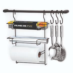 Cook Home Kit 6 Cozinha Black - os organizadores de cozinha são importantes para manter o cômodo bonito e bem arrumado. Como o nome já sugere, eles são os responsáveis pela organização dos utensílios de cozinha: podem acomodar os talheres, pratos e outras louças no dia a dia. - aqui, você encontra um kit barra de cozinha bem completo. Ele vem com ganchinhos para o encaixe de copos, canecas, um porta rolo. Especificações: - marca: arthi - ref.: 2525 - ean: 7897807425258 - dimensões: c. 52 x l. 14 x a. 43 cm - cor: preto - : 3 meses Itens que acompanham: - 1 barra de 49 cm. - 3 ganchos - 1 porta rolos - 1 kit para pendurar com parafusos e buchas. Marca: Não Informado Ean: 7897807425258