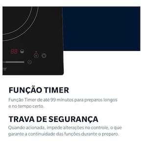 Equipado com duas bocas, sendo uma media e uma grande, o Cooktop Oster oferece versatilidade para preparar desde refeicoes rapidas ate pratos mais elaborados. Com uma potencia maxima de 3000 W, proporciona agilidade no cozimento, enquanto o acendedor automatico e o timer integrado trazem praticidade e seguranca ao uso diario. A tecnologia de inducao nao so garante um aquecimento mais rapido e eficiente, mas tambem contribui para a economia de energia.