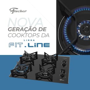 Cooktop Fischer Fit Line com 4 queimadores (1 tripla chama de 3.700W), mesa de vidro temperado preto, trempes esmaltadas e acendimento automático. Design moderno e eficiente.Alimentação