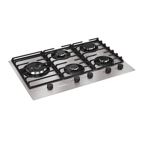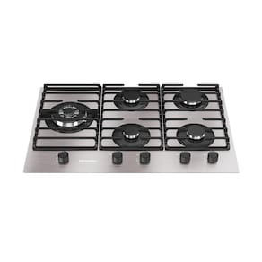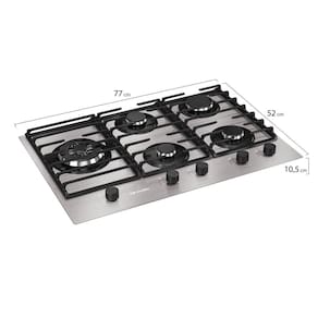 Cooktop 5 bocas a gás com mesa de alumínio anodizado, design robusto, queimador tripla chama de 3.600W, grades duplas em ferro fundido com acabamento esmaltado, acendimento superautomático, layout ampliado para uso simultâneo de várias panelas.Alimentação