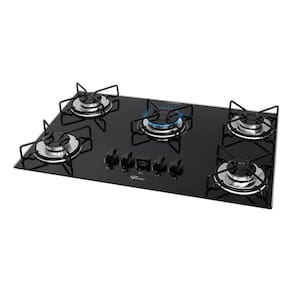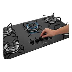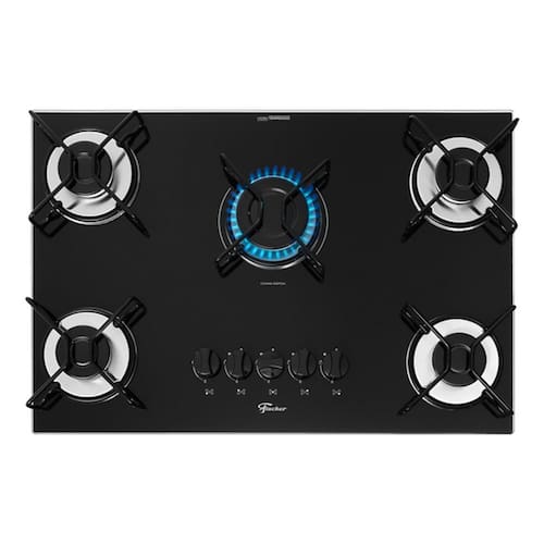 Cooktop a gás Fischer Fit Line com 5 bocas, acendimento superautomático e estrutura em vidro temperado preto.Luz de calor residual