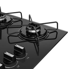 Cooktop a gás com 5 bocas, mesa de vidro temperado preta, acendimento superautomático, grades individuais resistentes, botões removíveis.Luz de calor residual