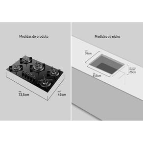 Marca: Dako | Voltagem: Bivolt | Cor do produto: Preto | Tipo de montagem: De embutir | Painel: Analógico | Manípulos: Plástico | Tipo de mesa: Vidro temperado | Alimentação: Gás | Tipo de Gás: GLP | Trempe: Individual - Ferro Fundido com 4 apoios | Acendimento: Super Automático | Total Potência (kW): 11,05 | Timer: Não | Potência dos Queimadores: 3Q Semirrápidos de 1,65kW, 1Q Mega Chama de 2,85 kW e 1 Tripla Chama de 3,25 kW | Dimensões do Produto (largura x altura x profundidade) em cm: 73,5 x 12 x 46 | Dimensões do Nicho (largura x altura x profundidade) em cm: 64,5 x 20 x 36 | Dimensões da Embalagem (largura x altura x profundidade) em cm: 76,6 x 16,5 x 47,2 | Tomada (A) Tomada (A): 10A | Plug Plug (A): Plugue 90 Tipo N 2P+T 3A/250Vca | Código Produto: 300001966 | Código EAN: 7908853800231 | Tipos de alimentação: Gás | Voltagem: Bivolt