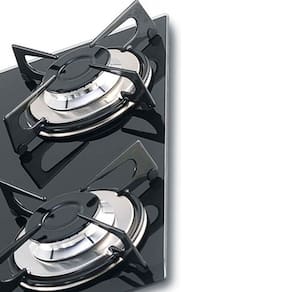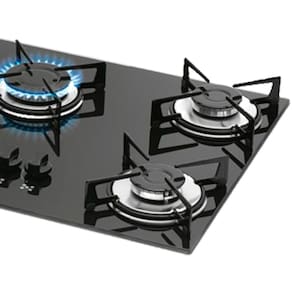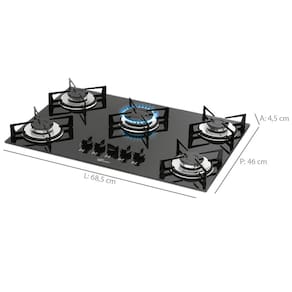 Vidro temperado bisote preto ebano ou branco polar 5 queimadores, sendo: 1 queimador rapido -3000W- 3 queimadores semirrapidos -1750W- 1 queimador auxiliar -1000W- Acendimento super automatico Trempe individual Tipo de Gas: GLP