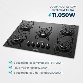 POTÊNCIA TOTAL DE 2 queimadores ultrarrápidos (2x 2650W) 1 queimador rápido (2350W) 2 queimadores semirrápidos (2x1700W)