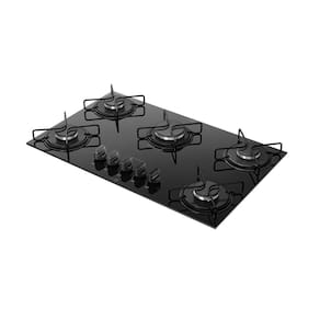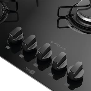 Cooktop Atlas Agile Up com 5 bocas, mesa de vidro temperado preta, acendimento superautomático, trempes individuais de arame com 4 pontos de apoio, botões removíveis e mega chama.Luz de calor residual