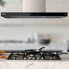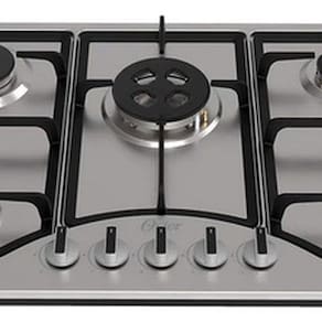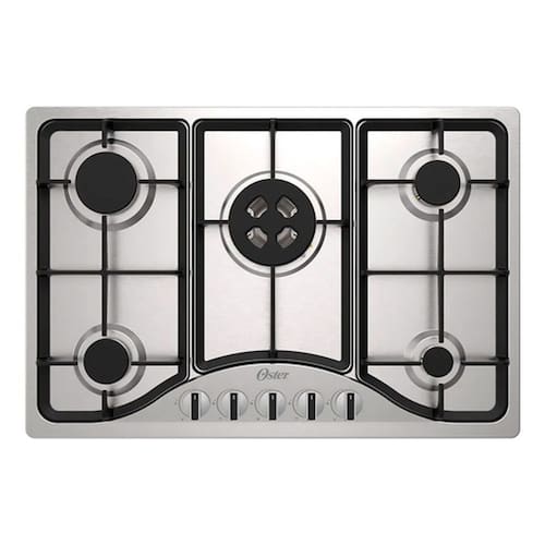 Cooktop a gás Inox Oster com 5 queimadores, sendo um ultra rápido de tripla chama (4000W), um rápido (3000W), dois médios (1750W) e um auxiliar (900W). Acendimento automático e sistema Flameout Safety.Luz de calor residual
