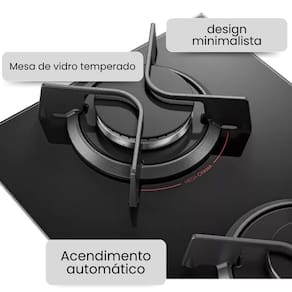 Cooktop à Gás Dako Supreme com 2 bocas, mesa de vidro temperado preta, mega chama de 2,85kW, acendimento superautomático, grades de ferro fundido, ideal para espaços compactos.Alimentação