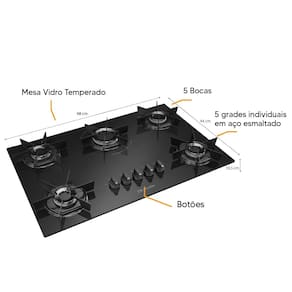 Mesa de vidro temperado preta, 5 bocas, Ultra Chama, Acendimento automático, botões ergonômicos, trempes de ferro fundido.Luz de calor residual