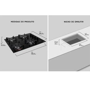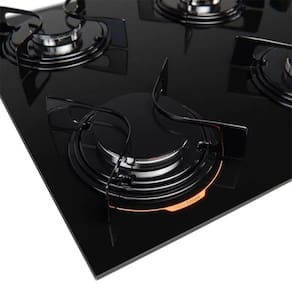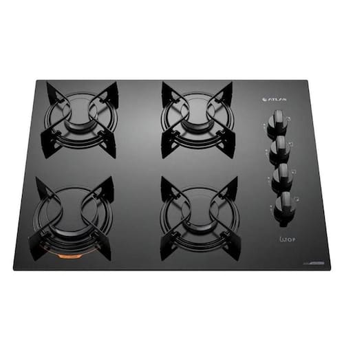 Cooktop Atlas U.top com 4 bocas, acendimento superautomático, mesa de vidro temperado, trempes individuais de aço esmaltado e queimadores potentes.Alimentação