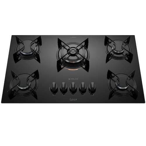 Cooktop Atlas UTOP 5 bocas com mesa de vidro preto, acendimento superautomático, queimadores Mega Chama e Tripla Chama, grades individuais de aço esmaltado e botões removíveis.Luz de calor residual