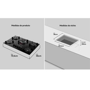 Design Moderno e renovado Vidro temperado, ultrarresistente e fácil de limpar 5 queimadores com tripla chama – mais velocidade no preparo das receitas grades individuais de aço esmaltado estáveis e muito fáceis de limpar Queimadores selados que impedem e entrada de sujeirasBotões removíveis para não sobrar nenhuma sujeirinha Acendimento superautomático, “Girou, ascendeu” - Muito prático de usarDimensões do produto