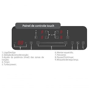 O Painel Touch com slide control é intuitivo e fácil de usar: basta deslizar o dedo suavemente para selecionar a potência desejada. Quer mais funcionalidades? O cooktop possui trava de segurança, que ajuda a evitar acidentes; indicador de calor residual, que alerta quando a superfície ainda está quente após o uso; e o detector de panela, que garante que o cooktop só funcione quando uma panela estiver devidamente posicionada.