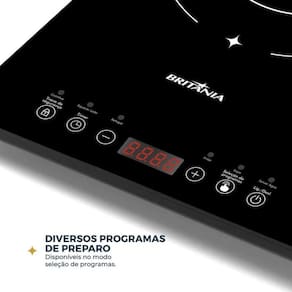 Cooktop de Indução Britânia com 1 boca, 6 programas pré-definidos, timer ajustável até 180 minutos, display digital, painel touch e desligamento automático de segurança.Alimentação